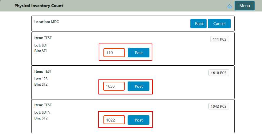 Once you have a filtered list of inventory, you can update the quantity for each line, and then select Post to post the journal lines and update the inventory quantity.