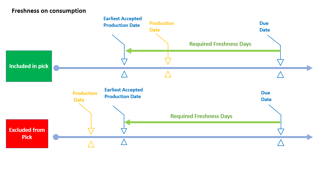 As illustrated below, for items being consumed, an item-lot will be restricted from being picked if the due date of the component minus the production date exceeds the number of required freshness days: