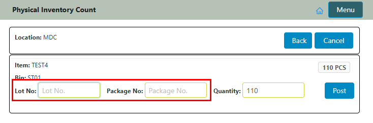 - When updating existing inventory, select a bin and after selecting Search, enter values in the Lot No. and/or Package No. fields.